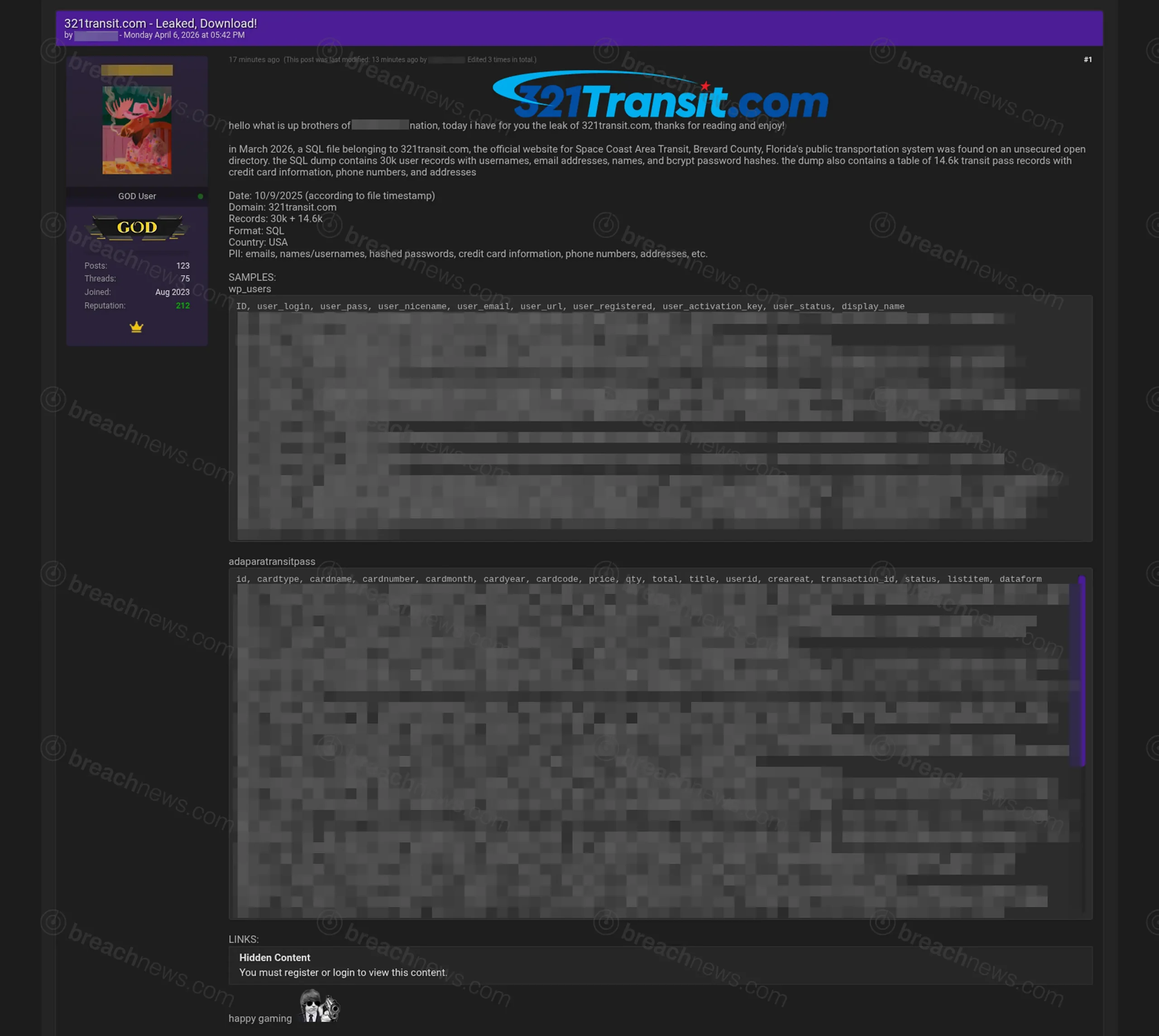A SQL database backup belonging to 321transit.com, the official website for Space Coast Area Transit (SCAT), Brevard County’s public transportation system, was allegedly left exposed on an unsecured open directory and has since been published online. The dump purportedly contains tens of thousands of user records and transit pass purchases, including payment card data stored in a way that violates industry security standards.