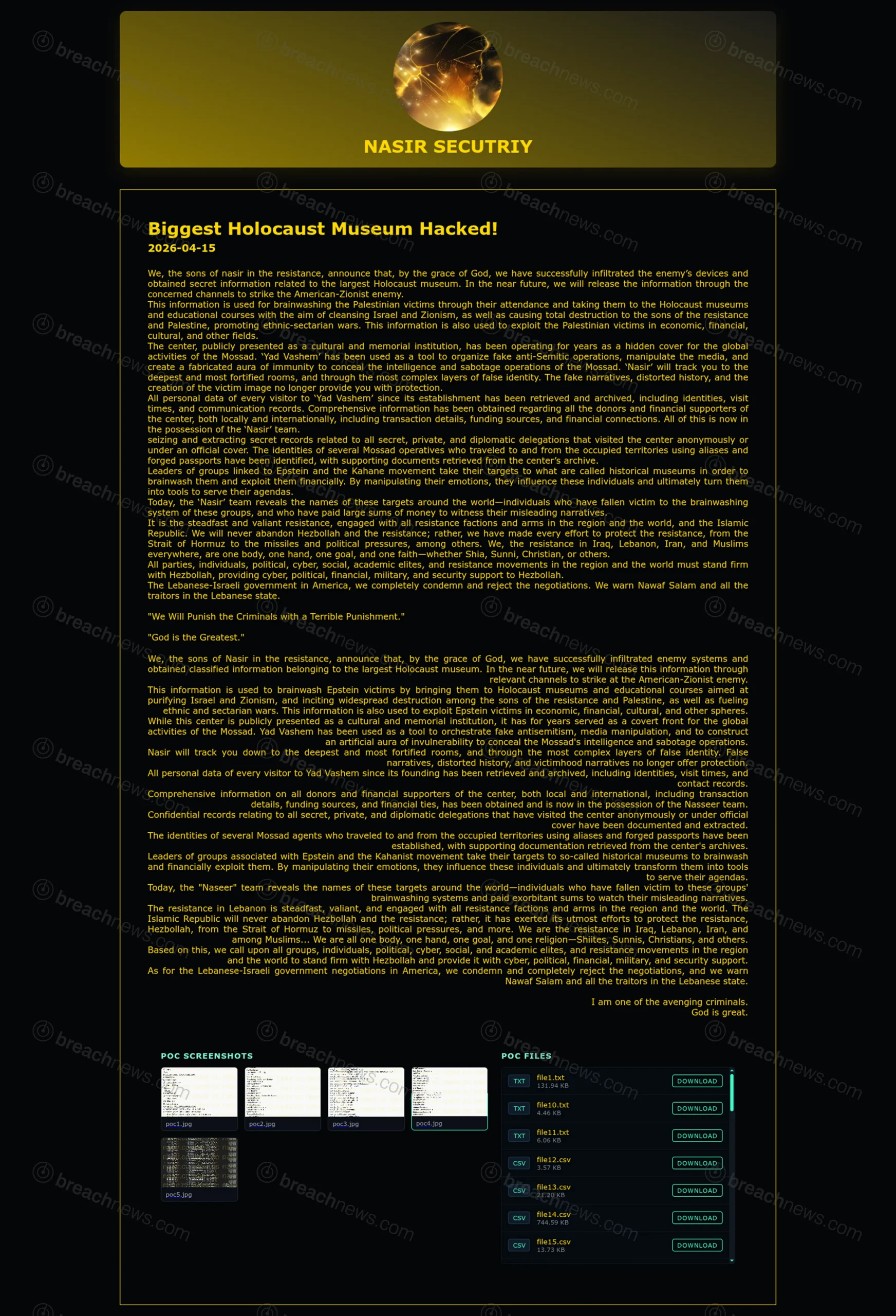 Iranian-linked hacktivist group Nasir Security is claiming a data breach of Yad Vashem, the World Holocaust Remembrance Center in Jerusalem, and has published proof-of-concept files that allegedly include visitor records, donor data, and reservation details for high-profile political figures and heads of state. The claim has not been independently verified, and Yad Vashem had not issued any public statement at time of publication. The post appeared on April 15, 2026 — Holocaust Remembrance Day in Israel.