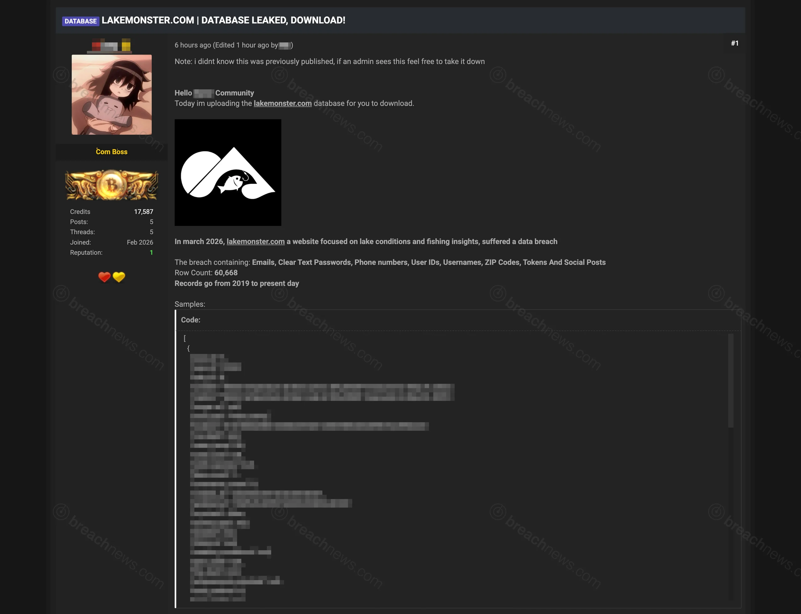 A threat actor posted what they claim is the complete database of Lakemonster.com, a fishing conditions and lake insights platform, to underground forums on March 30, 2026. The alleged dataset contains 60,668 user records spanning 2019 to present, including cleartext passwords, phone numbers, and location data.