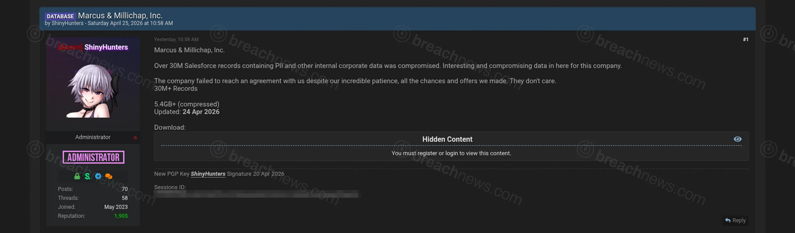 ShinyHunters is claiming a data breach involving Marcus & Millichap, Inc., alleging the compromise of more than 30 million Salesforce records containing personally identifiable information and internal corporate data. The claim surfaced April 25, 2026, and follows a broader wave of extortion-linked listings tied to the group’s ongoing campaign.