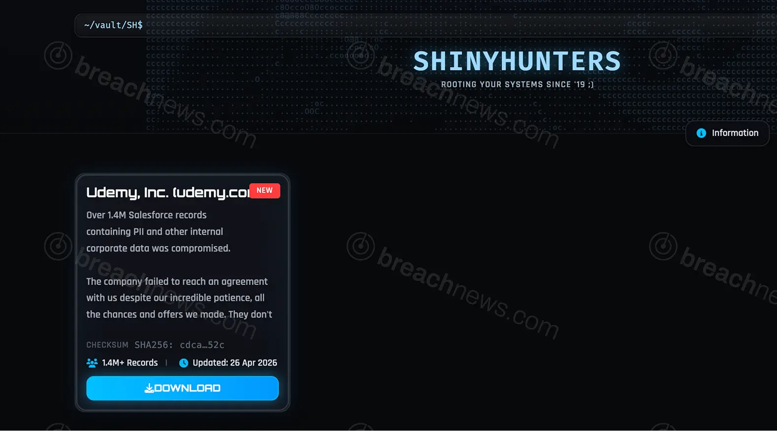 An alleged dataset tied to online learning platform Udemy has been published by ShinyHunters following what appears to be a failed extortion attempt. The data was reportedly listed on the group’s leak site on April 26, 2026, before being publicly released within days after negotiations failed.
