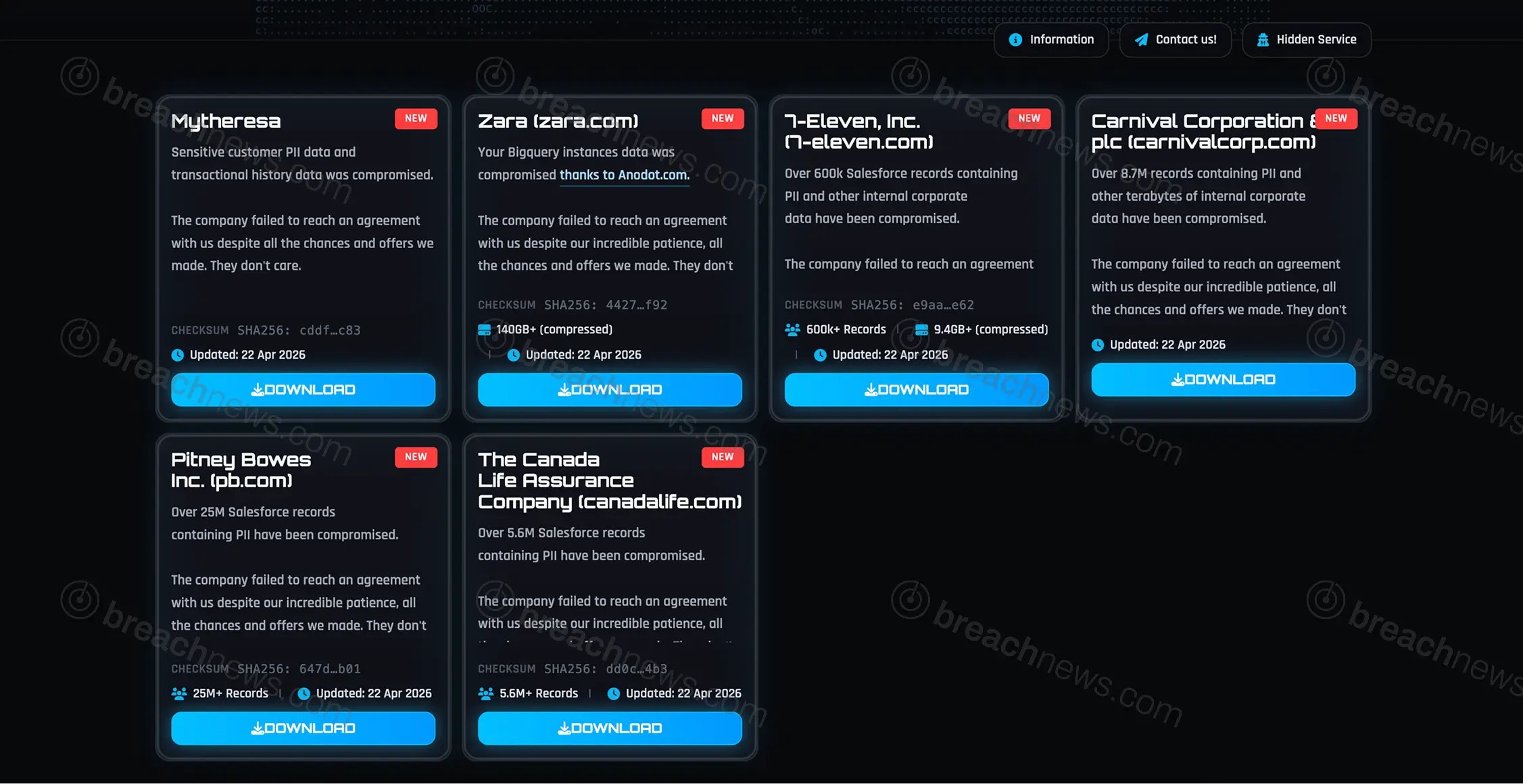According to the group’s latest update, the affected organizations include Mytheresa, Zara, 7-Eleven, Carnival Corporation & plc, Pitney Bowes, and The Canada Life Assurance Company. Each listing is accompanied by claims that negotiations failed, prompting the release of allegedly stolen data.