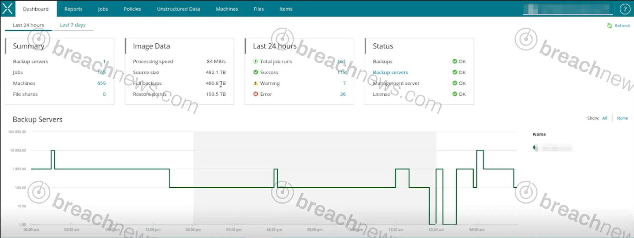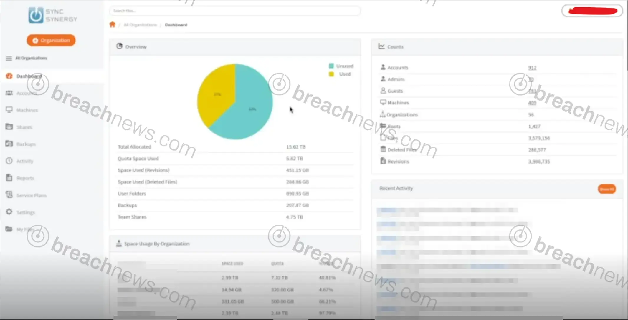 The claimed data includes virtual machine images, internal corporate files, shared storage data, and infrastructure information belonging to both Xtium and its managed service clients. Screenshots published alongside the claim show what appears to be a Veeam backup dashboard reflecting 659 machines, 165 jobs, and approximately 480TB of full backups, as well as a Synology ShareSync admin panel showing multiple client organizations across 56 tenants with over 3.5 million files and 288,000 deleted files logged.