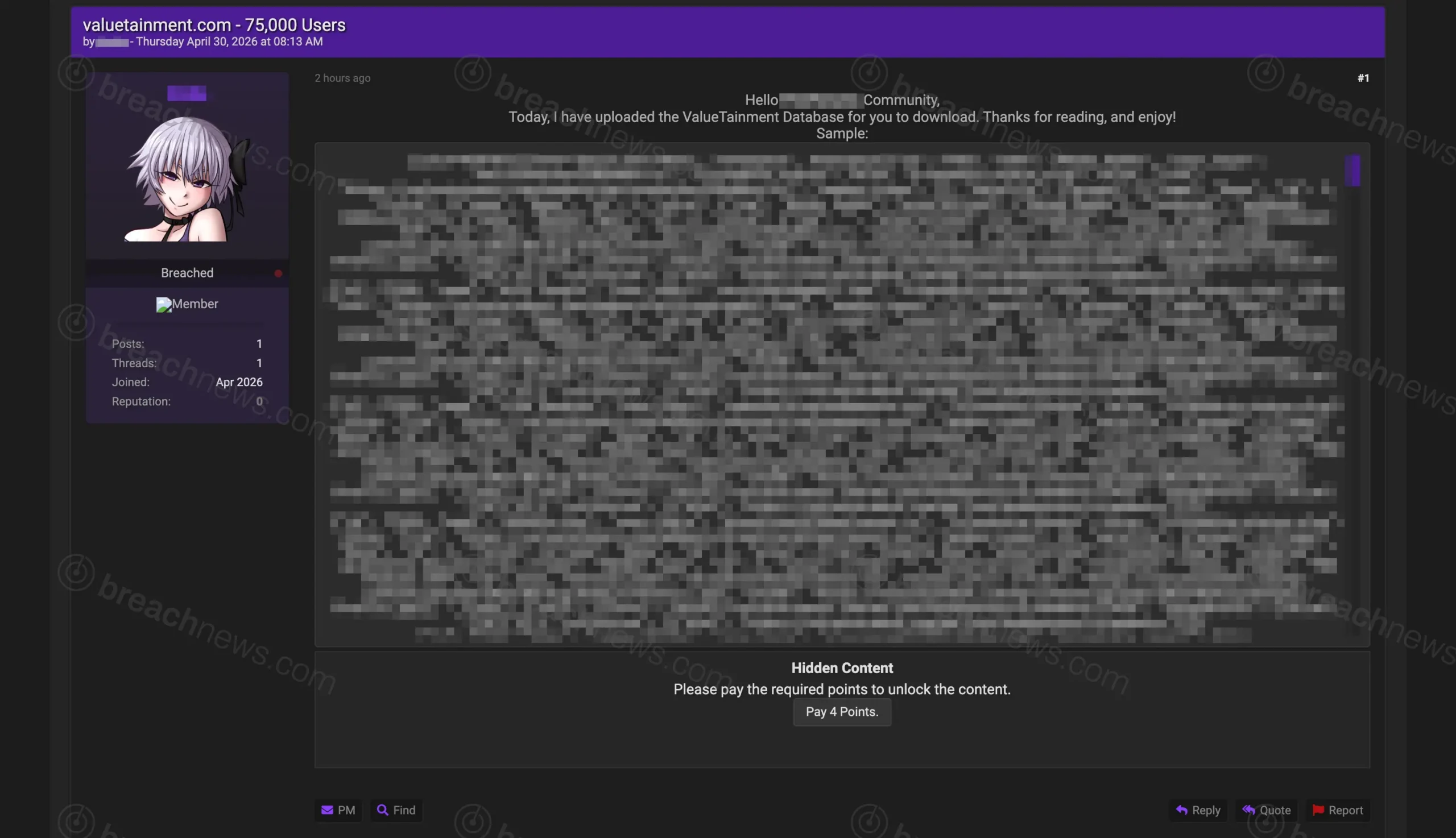 A threat actor has claimed to have leaked a database allegedly belonging to Valuetainment, a media platform known for its business and entrepreneurship content, including the PBD Podcast. The claim involves approximately 75,000 user records and was posted April 30, 2026 on a cybercrime forum.
