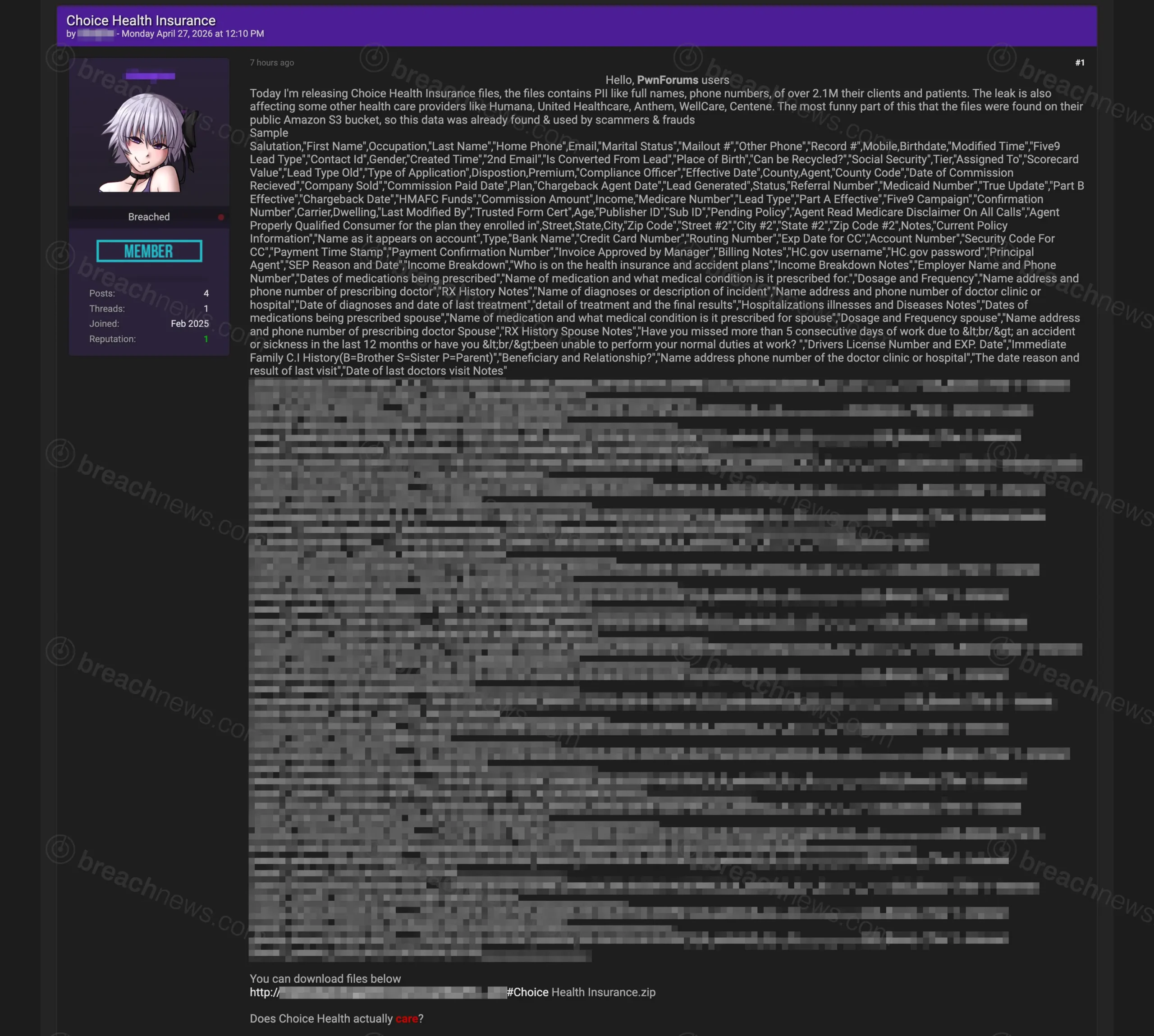 A threat actor has released a database allegedly tied to Choice Health Insurance, claiming to expose personally identifiable, financial, and medical data belonging to more than 2.1 million individuals. The dataset was posted publicly on April 27, 2026, and is being distributed without an apparent paywall, indicating immediate exposure rather than a traditional extortion scenario.